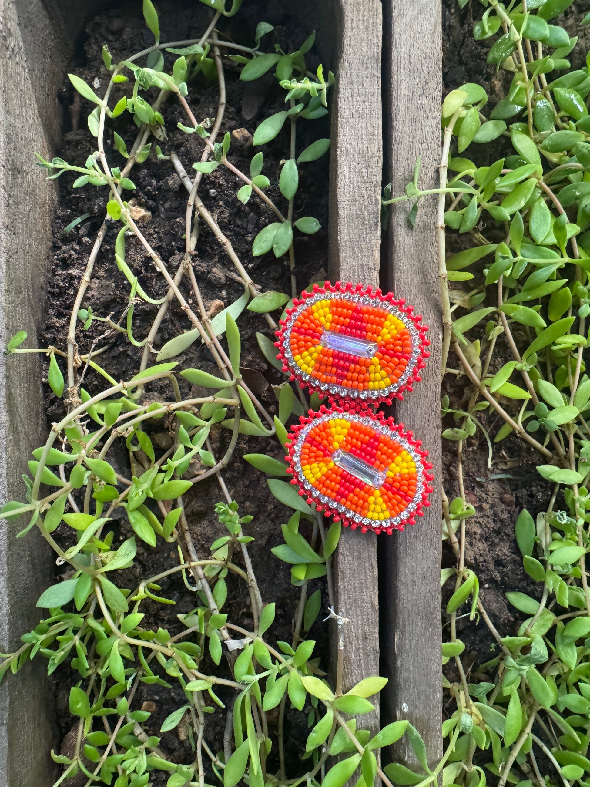 Handmade Beaded Round Post Earrings - Orange / Yellow - (1.5")